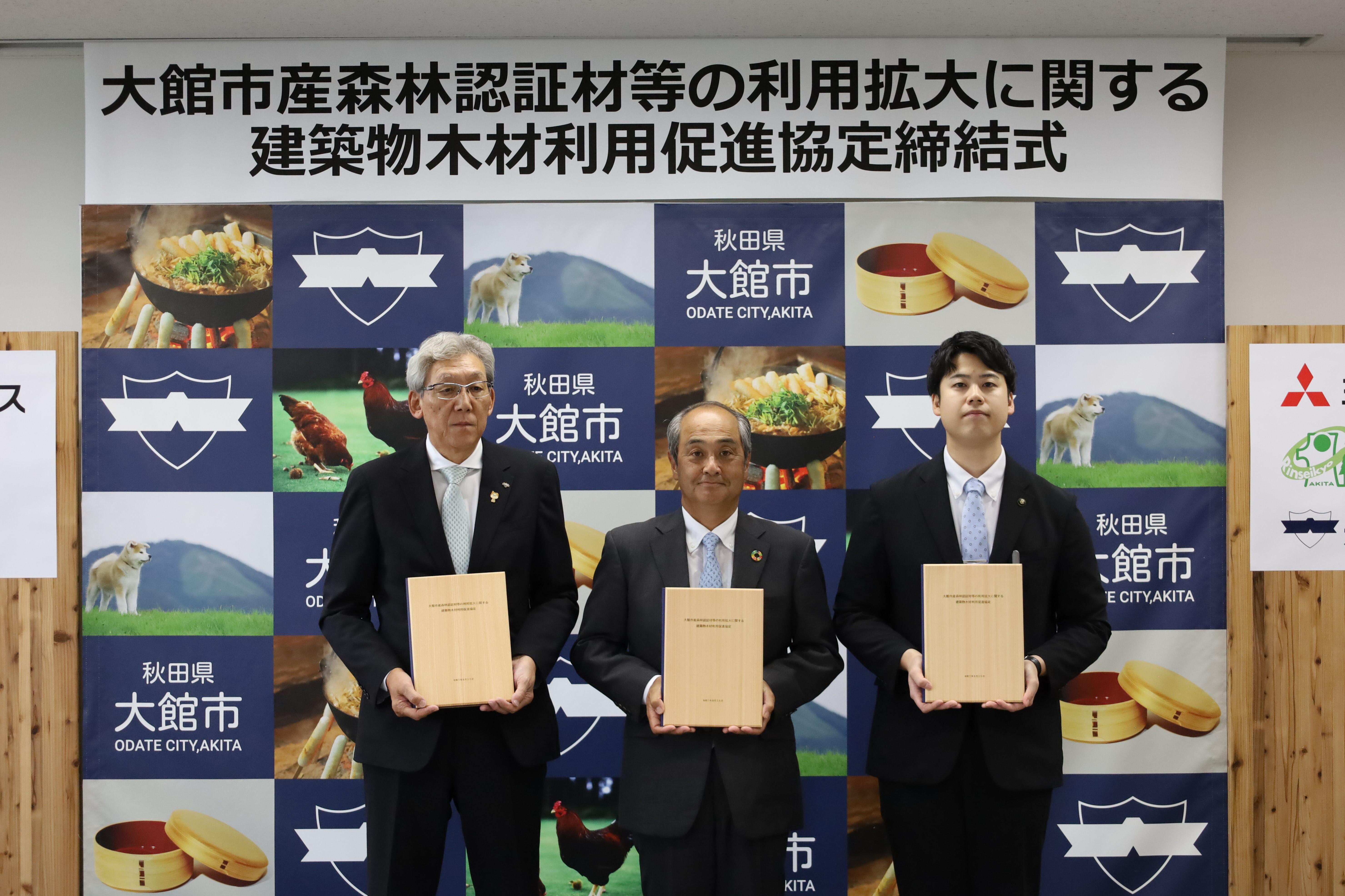 三菱地所レジデンス株式会社(以下、三菱地所レジデンス)、秋田県大館市(以下、大館市)、北鹿地域林業成長産業化協議会(以下、北鹿林成協)の三者は、2025年8月25日に「大館市産森林認証材等の利用拡大に関する建築物木材利用促進協定」を締結しました。