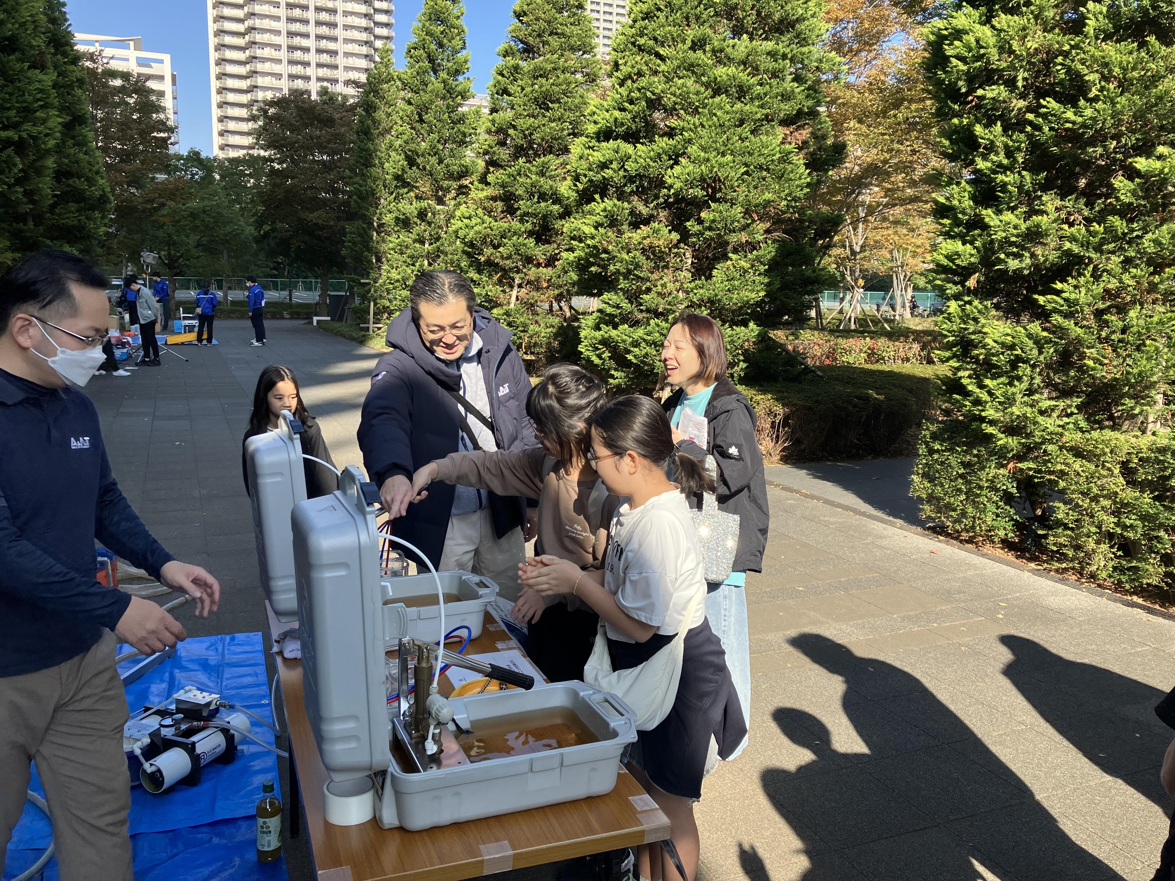 防災倉庫に備えている「浄水器」を体験する訓練。組み立て方法を学びながら"どんな水が浄水できるのか"等、浄水器の仕組みも理解しました。