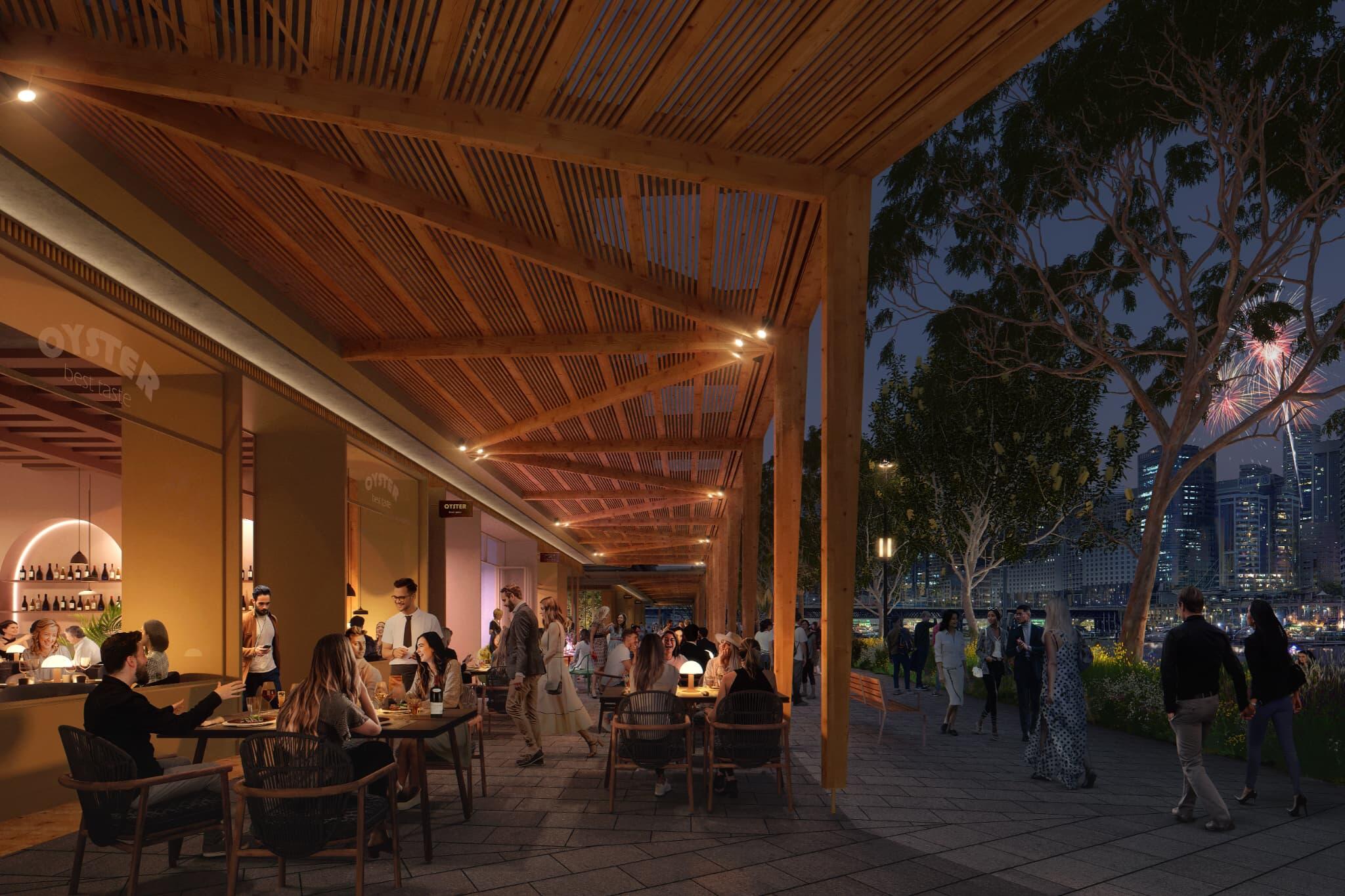 公共貢献用途として、5,000万豪ドル(約47.5億円※1)の公共空間整備費や700万豪ドル(約6.7億円※1)のパブリックアート費を投じ、1万㎡超の公共オープンスペースや3,500㎡のウォーターフロント・パークを整備し、エリアに活気と賑わいを生みだします。