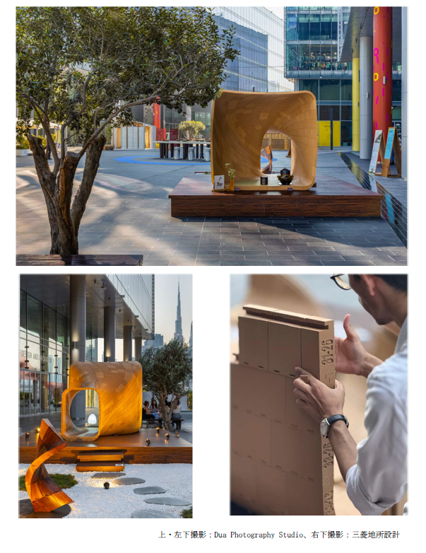 ドバイデザインウィーク2024に出展した、日本の伝統木工技術である継手と最先端の3Dプリント技術を融合させた、木質3Dプリント造の茶室パビリオン。木材加工の過程で発生する廃木粉をアップサイクルした木質樹脂を用いて高精度に成形された、約900枚の軽量曲面パネルで構成されている。それぞれの部材は釘や接着剤を使わず継手のみで接合できるため、手作業で短時間の組み立て・解体・再利用を実現。また、部材は軽量で、一般的な小包として輸送可能であり、生産フロー全体での環境配慮を図っている。